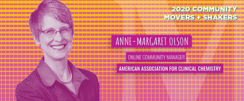How Anne-Margaret is movin’ and shakin’ in the community industry: With a decade of experience in the community industry, Anne-Margaret is a recognized expert and a go-to resource for community management. She works hard to ensure the communities she manages are lively and engaging, and she leads by example in encouraging others to make connections online and in person. She’s currently managing the community at the AACC, a global scientific and medical professional organization dedicated to clinical laboratory science and its application to healthcare.