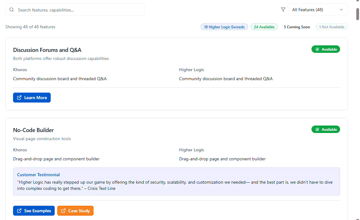 Use this interactive dashboard to compare Khoros and Higher Logic feature availability at a glance. “Available” shows what ships out-of-the-box, “Higher Logic Exceeds” highlights areas where Higher Logic outperforms Khoros, “Coming Soon” flags in-development capabilities, and “Not Available” marks features not currently offered.