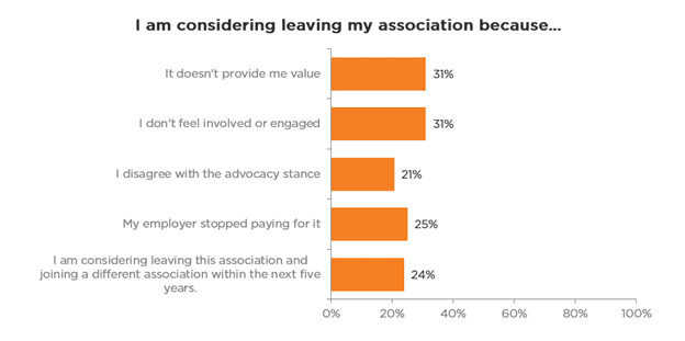 So why are members leaving their associations? When asked, they said the main reasons are lack of engagement and lack of value for the dues they’re paying. Other answers included employers not helping pay for memberships, other associations looking more appealing, and disagreeing with certain stands the association takes.