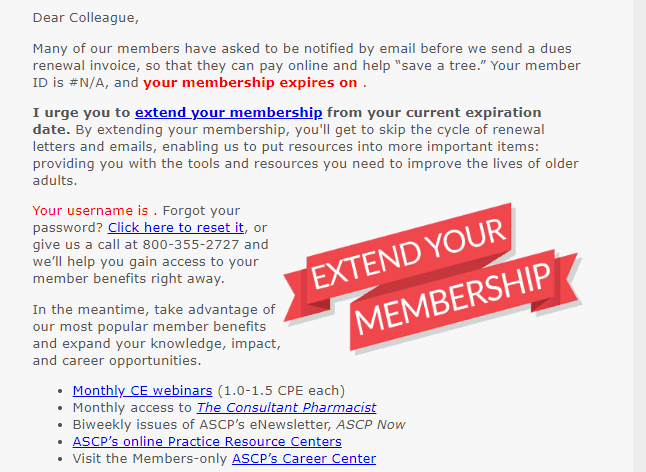 90 Days – Inactive: Rather than make the first touchpoint about an action that’s due months from now, ASCP changed their messaging to increase engagement, with a call to action to log in to their account. They knew that the resources and benefits they had to offer spoke for itself, but it was a matter of reminding members what was available.