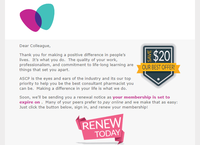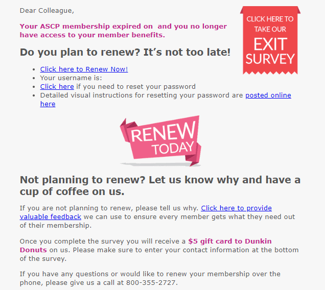 45 Days – Inactive: Right from the subject line, you can see that there’s an offer on the table. By changing the discount timeline (and making it crystal clear that this is the best offer they’ll receive), ASCP rewards members willing to renew early. If a member wants to save on membership, the time is now.