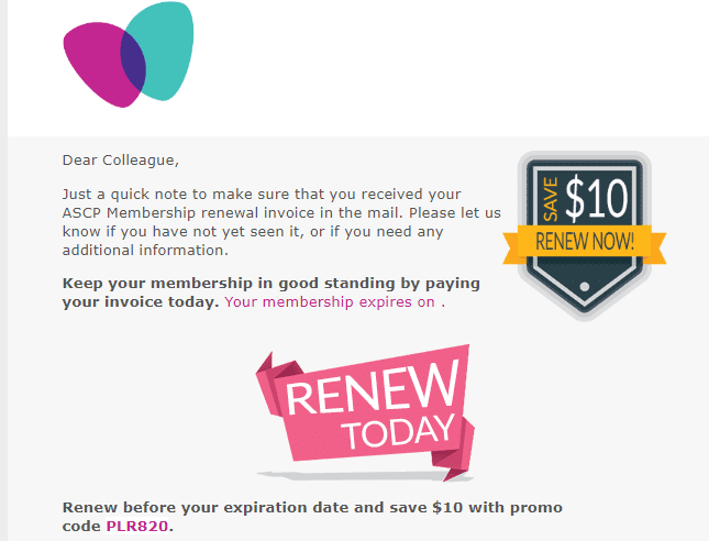 14 Days – Active: This is the last email ASCP sends before the renewal date. To effectively shorten the renewal timeline, they’ve added a sense of urgency to the subject line and the offer — going from $20 to $10 to demonstrate that this is the last chance to save if members want to renew.