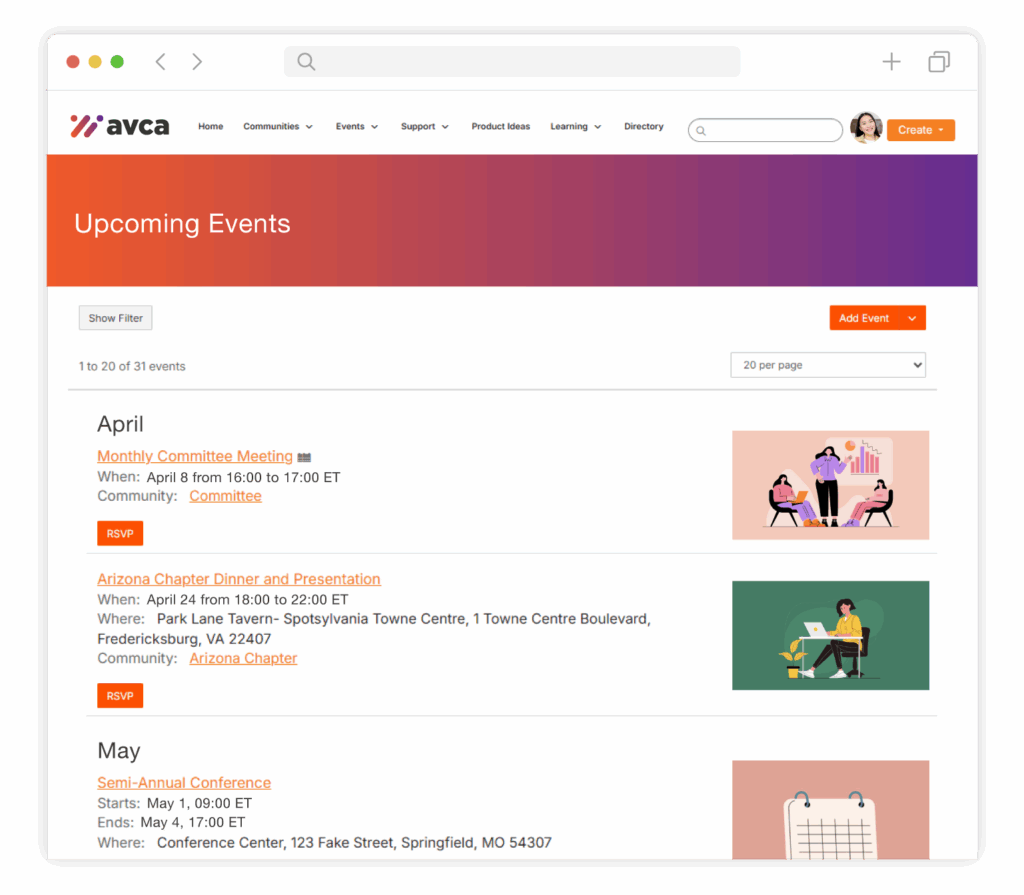Manage your events and provide users with an integrated calendar to view, add, edit, and find relevant events within their community.