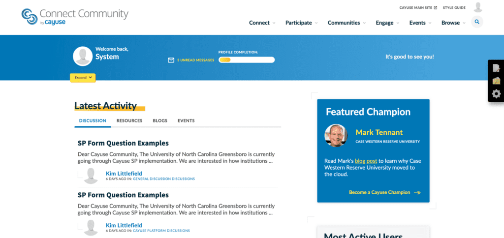 For our next community site design winner, we have Cayuse. The customer advocacy team at Cayuse worked with eConverse Media to integrate company branding into the community which resulted in a sleek, modern design with an intuitive user interface. We love it!