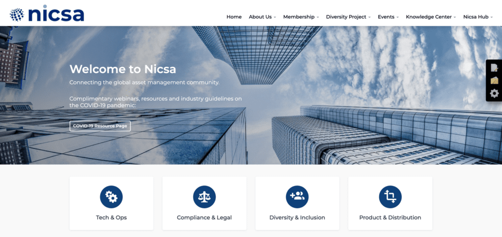 Our first winner for best online community website design is Nicsa. Nicsa is a nonprofit trade association that connects the global asset management community. Allie Walsh and the team at Nicsa worked with eConverse Media to design their new community site as part of an entire technology ecosystem upgrade, including a new association management system, learning management system, and community, at the same time as a rebrand. Call us impressed!